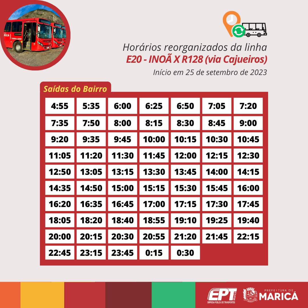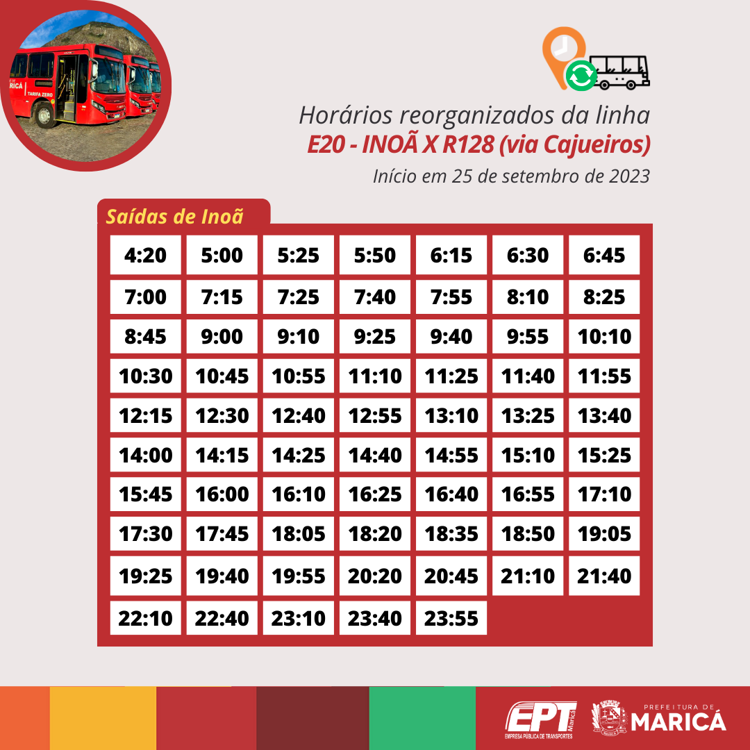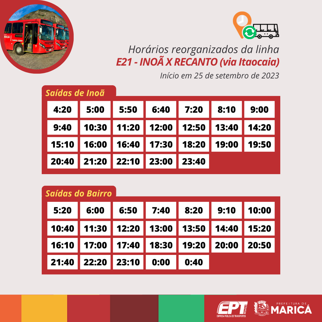 A Prefeitura de Maricá, por meio da Empresa Pública de Transportes (EPT), a partir da próxima segunda-feira (25/09), reorganizará os horários das linhas E20, E21, E22, E23, E24 e E24A dos Vermelhinhos de Inoã, terceiro distrito de Maricá.