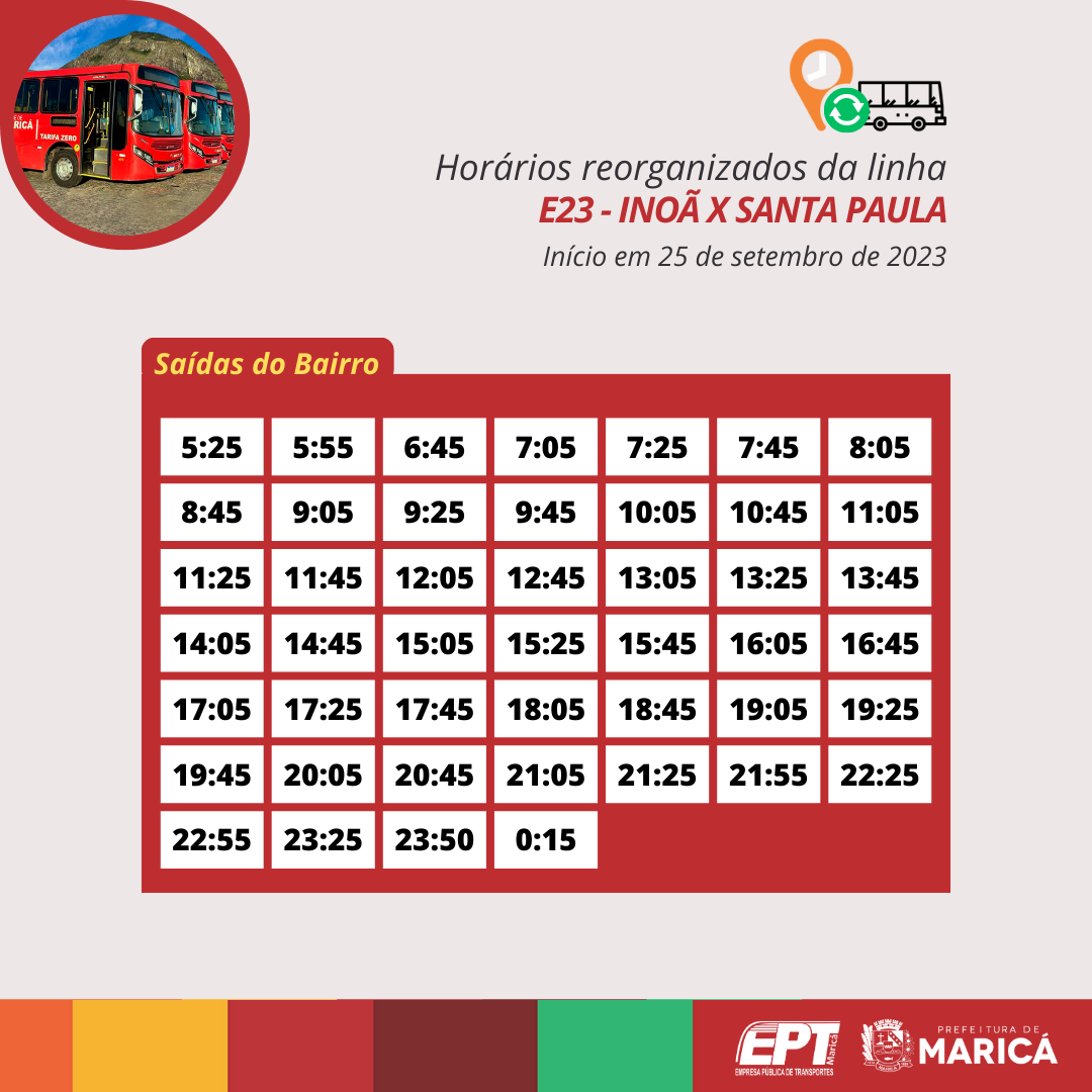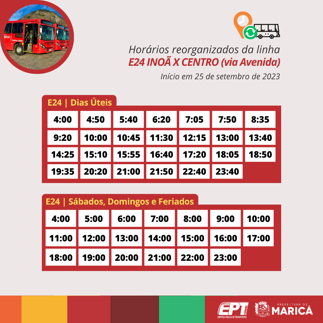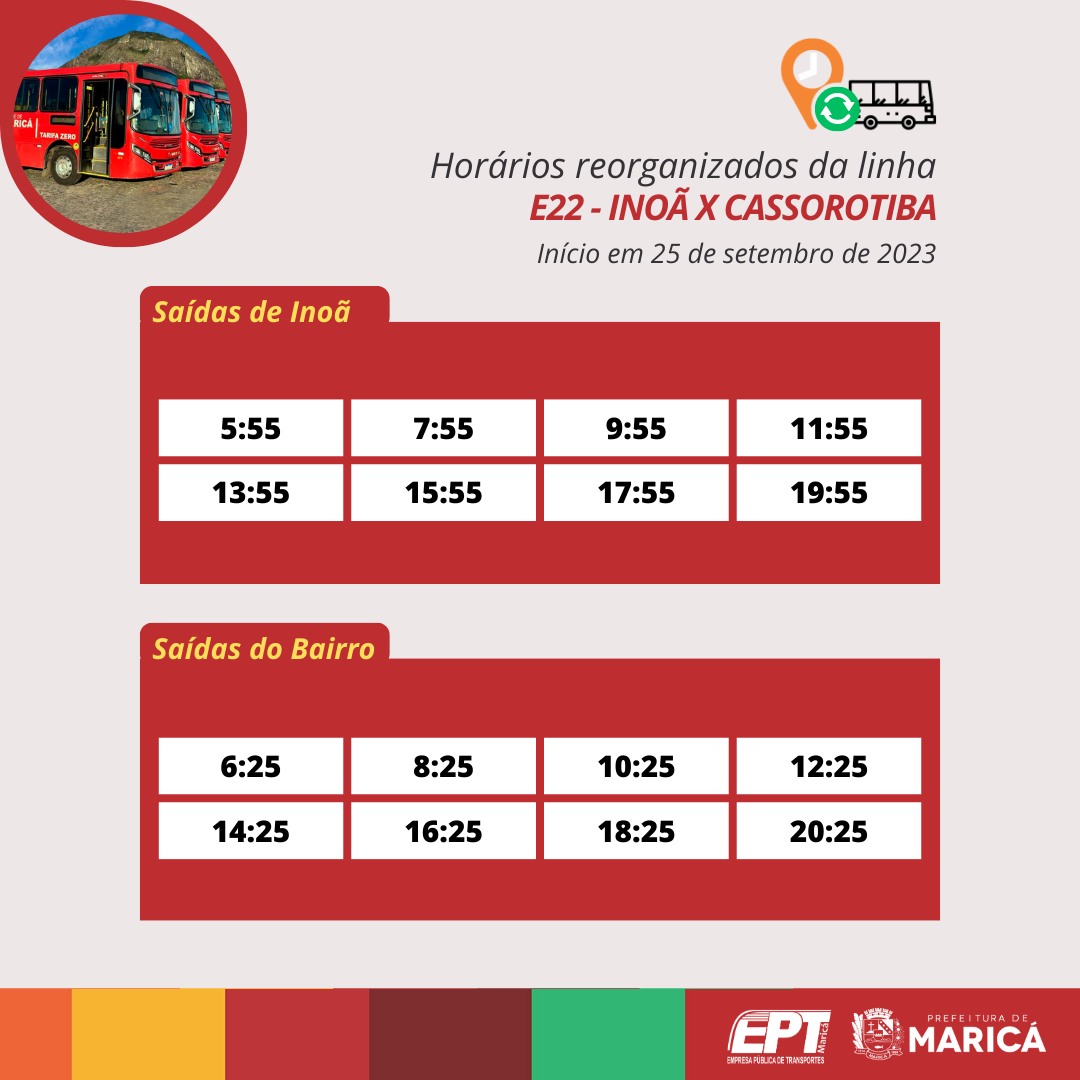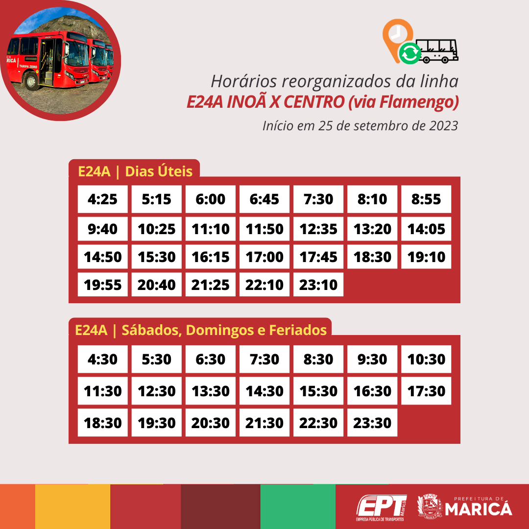 A Prefeitura de Maricá, por meio da Empresa Pública de Transportes (EPT), a partir da próxima segunda-feira (25/09), reorganizará os horários das linhas E20, E21, E22, E23, E24 e E24A dos Vermelhinhos de Inoã, terceiro distrito de Maricá.