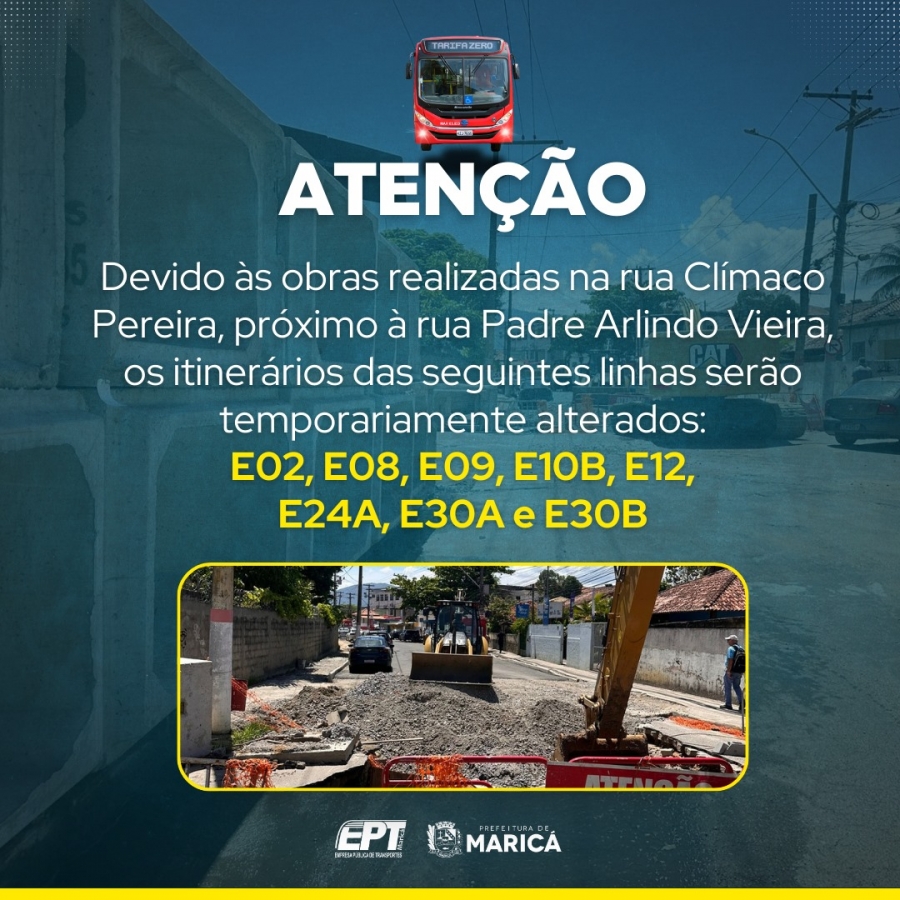 Informamos que, devido às obras realizadas pela SOMAR na rua Clímaco Pereira, próximo à rua Padre Arlindo Vieira, os itinerários das seguintes linhas serão temporariamente alterados: E02, E08, E09, E10B, E12, E24A, E30A e E30B.